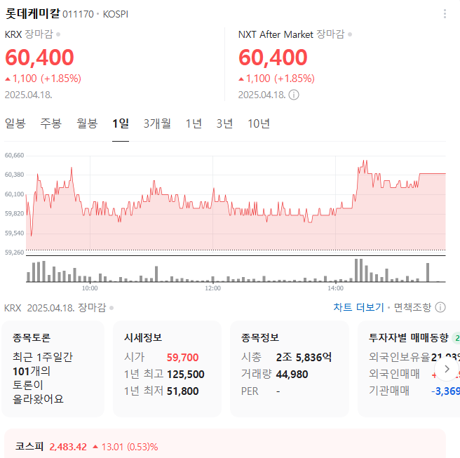 롯데케미칼의 현재 주가는 60,400원입니다. 전일 대비 -12.08원 이동한 모습입니다. 시가 총액은 2조5836억 원이며 발행 주식은 총 42,775,419주 입니다. 외국인이 보유한 비중은 20.71%입니다. 롯데케미칼 기업의 영업이익은 억 원을 달성했으며 배당 수익율은 -0.42% 입니다.