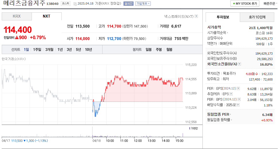 메리츠금융지주의 현재 주가는 114,500원입니다. 전일 대비 -3.62원 이동한 모습입니다. 시가 총액은 21조1400억 원이며 발행 주식은 총 180,014,473주 입니다. 외국인이 보유한 비중은 16.02%입니다. 메리츠금융지주 기업의 영업이익은 억 원을 달성했으며 배당 수익율은 7.83% 입니다.