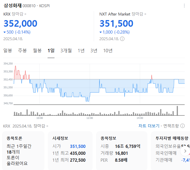 만약 단기 포트폴리오를 구성한다면 시가 총액과 장중 거래량도 체크해야 합니다. 삼성화재의 시가 총액은 16조6759억 원이며 장중 거래량은 16,801원 을 기록했습니다. 대주주의 정보는 크게 중요하지 않을 수 있으나 장기적인 관점에서는 확인해보는 것이 좋겠습니다.