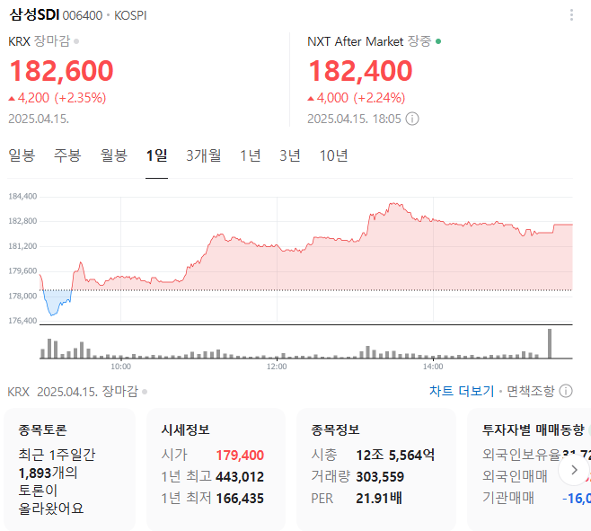 단기 포트폴리오를 구성할 때 시가 총액과 장중 거래량을 체크해야 합니다. 삼성SDI의 시가 총액은 12조5564억 원이며 장중 거래량은 278,232원 을 기록했습니다. 대주주의 정보는 크게 중요하지 않을 수도 있으나 장기적으로는 확인해보는 것이 좋겠습니다.