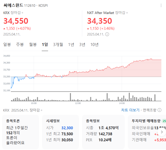 만약 단기 포트폴리오를 구성한다면 시가 총액과 장중 거래량을 살펴봐야 합니다. 씨에스윈드의 시가 총액은 1조4570억 원이며 장중 거래량은 142,738원 을 기록했습니다. 대주주의 정보는 중요하지 않을 수 있으나 장기적으로는 확인하는 것이 좋겠습니다.