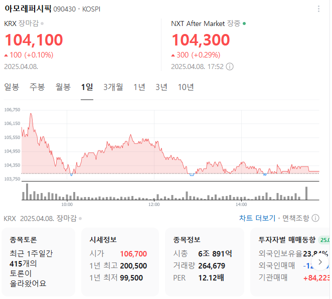 단기 포트폴리오를 구성할 때 시가 총액과 장중 거래량을 꼭 살펴봐야 합니다. 아모레퍼시픽의 시가 총액은 6조891억 원이며 장중 거래량은 349,131원 을 기록했습니다. 대주주의 정보는 크게 중요하지 않을 수 있지만 장기적으로는 확인해보는 것이 좋습니다.