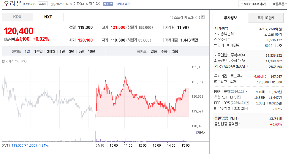 오리온의 현재 주가는 120,800원입니다. 전일 대비 원 이동한 모습입니다. 시가 총액은 4조7760억 원이며 발행 주식은 총 39,536,132주 입니다. 외국인이 보유한 비중은 28.69%입니다. 오리온 기업의 영업이익은 억 원을 달성했으며 배당 수익율은 8.40% 입니다.