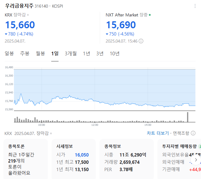 만약 단기 포트폴리오를 구성한다면 시가 총액과 장중 거래량을 살펴봐야 합니다. 우리금융지주의 시가 총액은 11조6290억 원이며 장중 거래량은 1,773,026원 을 기록했습니다. 대주주의 정보는 크게 중요하지 않지만 장기적인 관점에서는 확인이 필요합니다.
