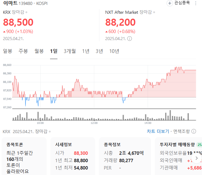 이마트의 현재 주가는 87,600원입니다. 전일 대비 원 이동한 모습입니다. 시가 총액은 2조4670억 원이며 발행 주식은 총 27,595,819주 입니다. 외국인이 보유한 비중은 19.05%입니다. 이마트 기업의 영업이익은 억 원을 달성했으며 배당 수익율은 2.73% 입니다.