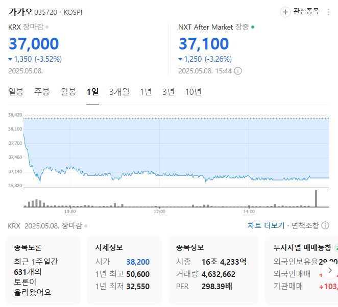 카카오의 현재 주가는 38,350원입니다. 전일 대비 -5.66원 이동한 모습입니다. 시가 총액은 16조4233억 원이며 발행 주식은 총 441,711,295주 입니다. 외국인이 보유한 비중은 29.00%입니다. 카카오 기업의 영업이익은 억 원을 달성했으며 배당 수익율은 7.59% 입니다.