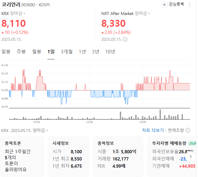 코리안리의 현재 주가는 8,100원입니다. 전일 대비 -10원 이동한 모습입니다. 시가 총액은 1조5800억 원이며 발행 주식은 총 194,821,031주 입니다. 외국인이 보유한 비중은 26.88%입니다. 코리안리 기업의 영업이익은 억 원을 달성했으며 배당 수익율은 9.45% 입니다.