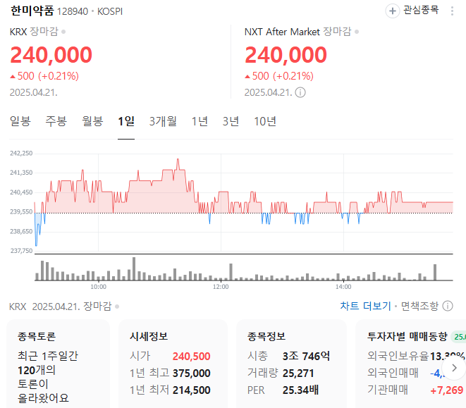 만약 단기 포트폴리오를 구성한다면 시가 총액과 장중 거래량을 확인해야 합니다. 한미약품의 시가 총액은 3조746억 원이며 장중 거래량은 32,685원 을 기록했습니다. 대주주의 정보는 중요하지 않을 수도 있지만 장기적인 관점에서는 확인이 필요합니다.
