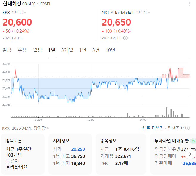 현대해상의 현재 주가는 20,600원입니다. 전일 대비 -7.62원 이동한 모습입니다. 시가 총액은 1조8416억 원이며 발행 주식은 총 89,400,000주 입니다. 외국인이 보유한 비중은 37.63%입니다. 현대해상 기업의 영업이익은 억 원을 달성했으며 배당 수익율은 9.45% 입니다.