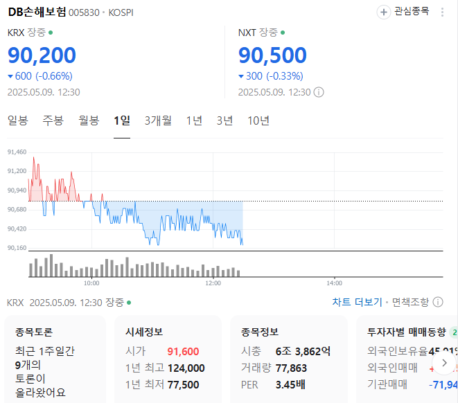 DB손해보험의 현재 주가는 90,800원입니다. 전일 대비 -500원 이동한 모습입니다. 시가 총액은 6조3932억 원이며 발행 주식은 총 70,800,000주 입니다. 외국인이 보유한 비중은 45.91%입니다. DB손해보험 기업의 영업이익은 억 원을 달성했으며 배당 수익율은 9.45% 입니다.