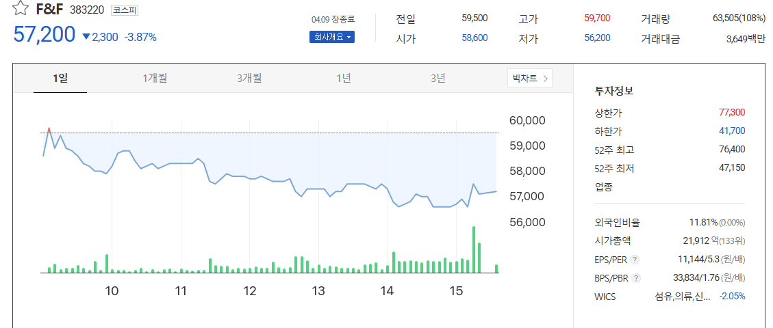 단기 포트폴리오를 구성할 때 시가 총액과 장중 거래량을 꼭 살펴봐야 합니다. F&F의 시가 총액은 2조1912억 원이며 장중 거래량은 58,264원 을 기록했습니다. 대주주의 정보는 크게 중요하지 않을 수도 있으나 장기적으로는 확인해보는 것이 좋겠습니다.