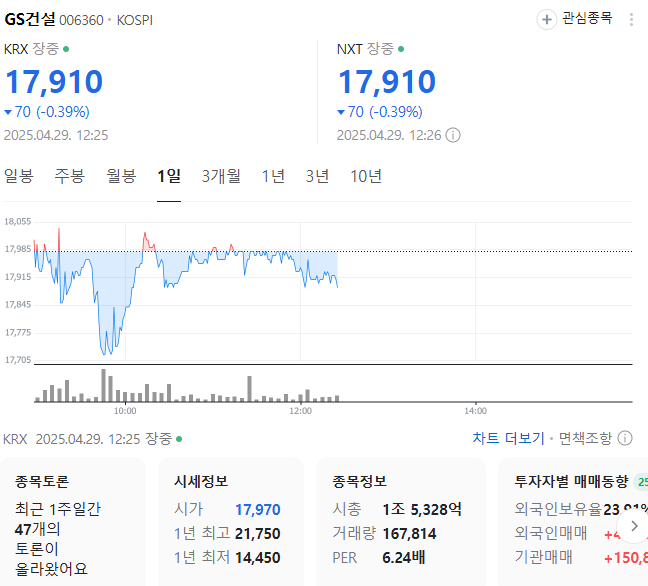 단기 포트폴리오를 구성할 시에는 시가 총액과 장중 거래량도 살펴봐야 합니다. GS건설의 시가 총액은 1조5336억 원이며 장중 거래량은 509,682원 을 기록했습니다. 대주주의 정보는 크게 중요하지 않지만 장기적인 관점에서는 확인해보는 것이 좋습니다.