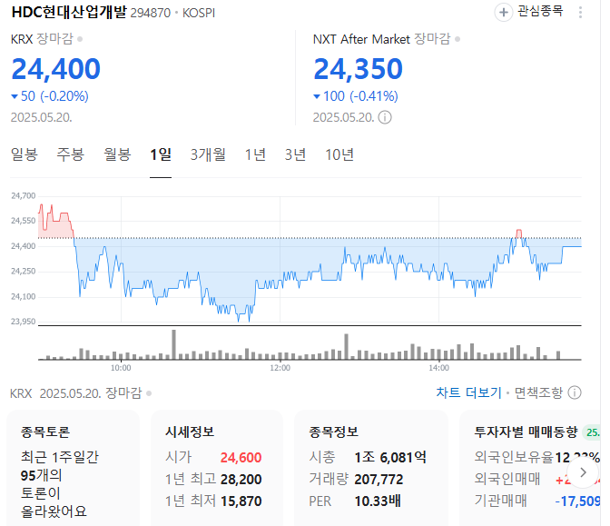 HDC현대산업개발의 현재 주가는 24,450원입니다. 전일 대비 -400원 이동한 모습입니다. 시가 총액은 1조6081억 원이며 발행 주식은 총 65,907,330주 입니다. 외국인이 보유한 비중은 12.20%입니다. HDC현대산업개발 기업의 영업이익은 억 원을 달성했으며 배당 수익율은 1.06% 입니다.