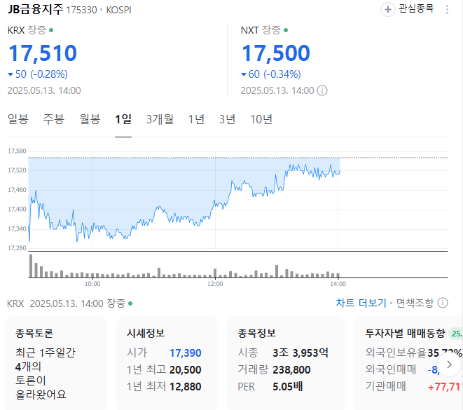 단기 포트폴리오를 구성할 때는 시가 총액과 장중 거래량도 중요합니다. JB금융지주의 시가 총액은 3조3934억 원이며 장중 거래량은 315,770원 을 기록했습니다. 대주주의 정보는 중요하지 않을 수도 있으나 장기적인 관점에서는 확인이 필요합니다.
