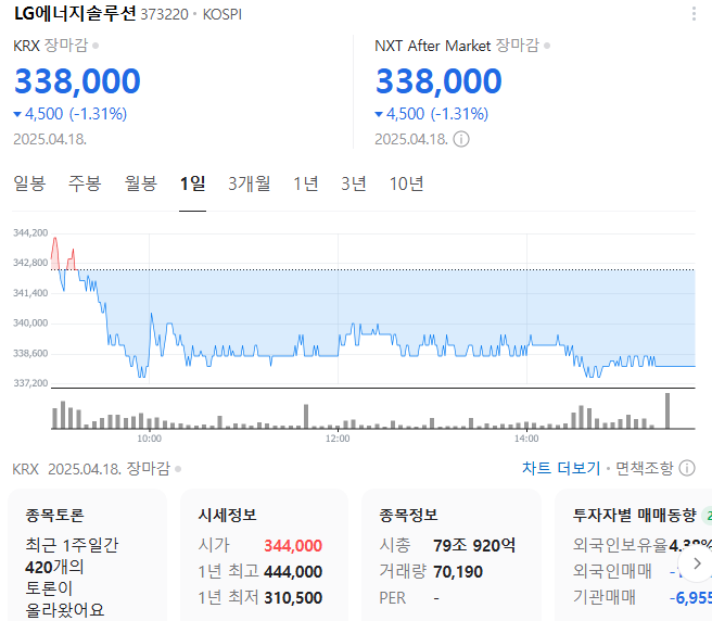 단기 포트폴리오를 구성할 때는 시가 총액과 장중 거래량을 살펴봐야 합니다. LG에너지솔루션의 시가 총액은 79조920억 원이며 장중 거래량은 70,190원 을 기록했습니다. 대주주의 정보는 중요하지 않을 수 있지만 장기적으로는 확인해보는 것이 좋겠습니다.