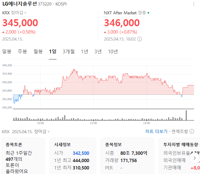 단기 포트폴리오를 구성할 경우 시가 총액과 장중 거래량도 살펴봐야 합니다. LG에너지솔루션의 시가 총액은 80조7300억 원이며 장중 거래량은 192,936원 을 기록했습니다. 대주주의 정보는 중요하지 않을 수 있지만 장기적인 관점에서는 확인하는 것이 좋겠습니다.