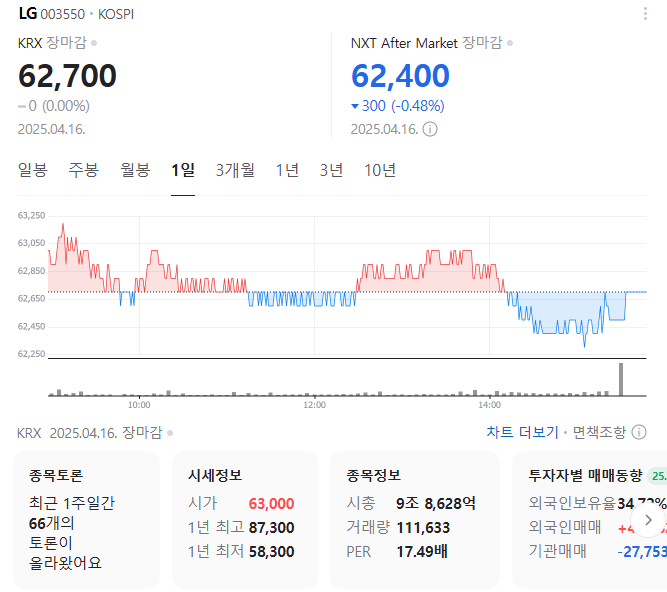LG의 현재 주가는 62,700원입니다. 전일 대비 -6.97원 이동한 모습입니다. 시가 총액은 9조8628억 원이며 발행 주식은 총 157,300,993주 입니다. 외국인이 보유한 비중은 34.69%입니다. LG 기업의 영업이익은 억 원을 달성했으며 배당 수익율은 7.83% 입니다.