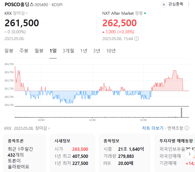 단기 포트폴리오를 구성한다면 시가 총액과 장중 거래량도 살펴봐야 합니다. POSCO홀딩스의 시가 총액은 21조1640억 원이며 장중 거래량은 282,409원 을 기록했습니다. 대주주의 정보는 중요하지 않을 수도 있지만 장기적인 관점에서는 확인하는 것이 좋습니다.