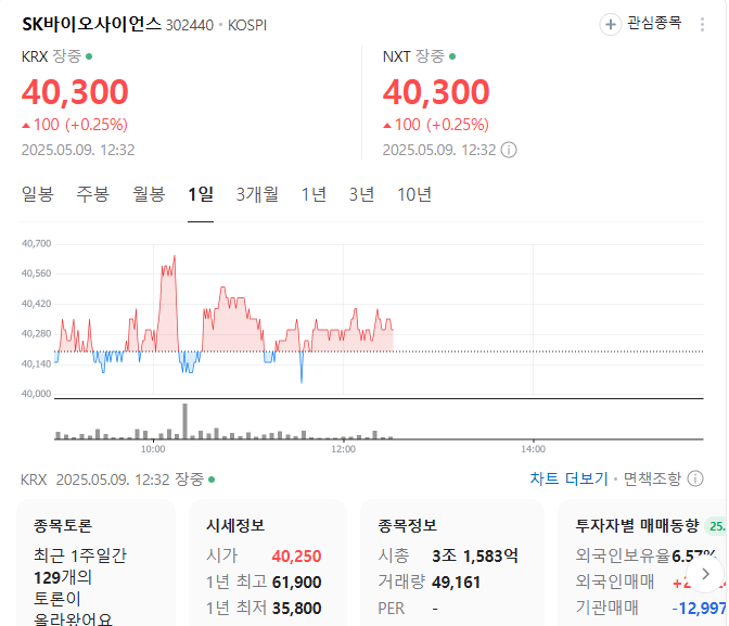 만약 단기 포트폴리오를 구성한다면 시가 총액과 장중 거래량을 확인해야 합니다. SK바이오사이언스의 시가 총액은 3조1622억 원이며 장중 거래량은 238,413원 을 기록했습니다. 대주주의 정보는 중요하지 않을 수도 있지만 장기적인 관점에서는 확인이 필요합니다.