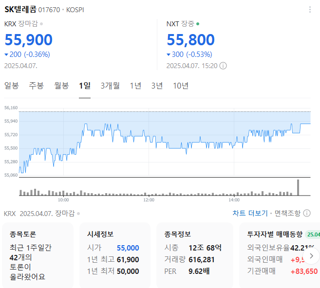 SK텔레콤의 현재 주가는 56,100원입니다. 전일 대비 -1.06원 이동한 모습입니다. 시가 총액은 12조68억 원이며 발행 주식은 총 214,790,053주 입니다. 외국인이 보유한 비중은 42.21%입니다. SK텔레콤 기업의 영업이익은 억 원을 달성했으며 배당 수익율은 5.64% 입니다.